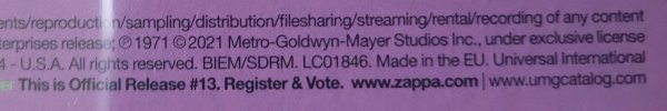 Published By : Zappa Family Trust, Published By : Munchkin Music, Phonographic Copyright (p) : Metro-Goldwyn-Mayer Studios Inc., Copyright (c) : Metro-Goldwyn-Mayer Studios Inc., Licensed To : UMG Recordings, Inc., Distributed By : Universal Music Enterprises, Remastered At : Bernie Grundman Mastering, Pressed By : Optimal Media GmbH, Pressed By : Optimal Media GmbH